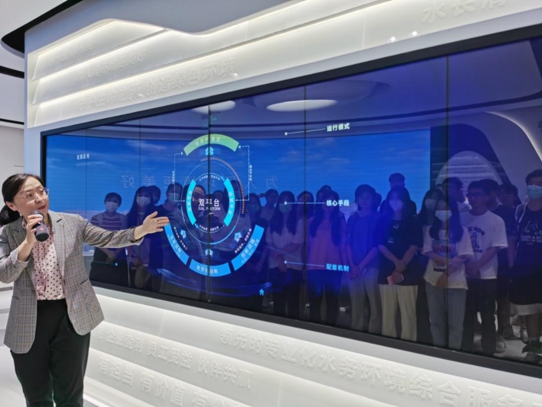会议开始前,大家先参观了集团展厅,北控水务研究院科技管理主管曹珊女士进行了精彩的讲解。同学们不仅明晰了北控水务集团的发展历史、经营规模、项目运营情况等,还了解了集团的运营、管理理念和方式等。