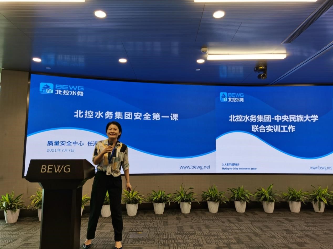 北控水务质量安全中心任泽旭女士为同学们进行了详细的实习安全培训。培训从“办公室安全”和“水厂安全”两个方面展开,用短片和漫画的形式生动形象地介绍了常见的安全隐患以及应对措施和安全规范,并进行了互相交流。培训过程给同学们留下了深刻的印象,提高了同学们的安全意识。