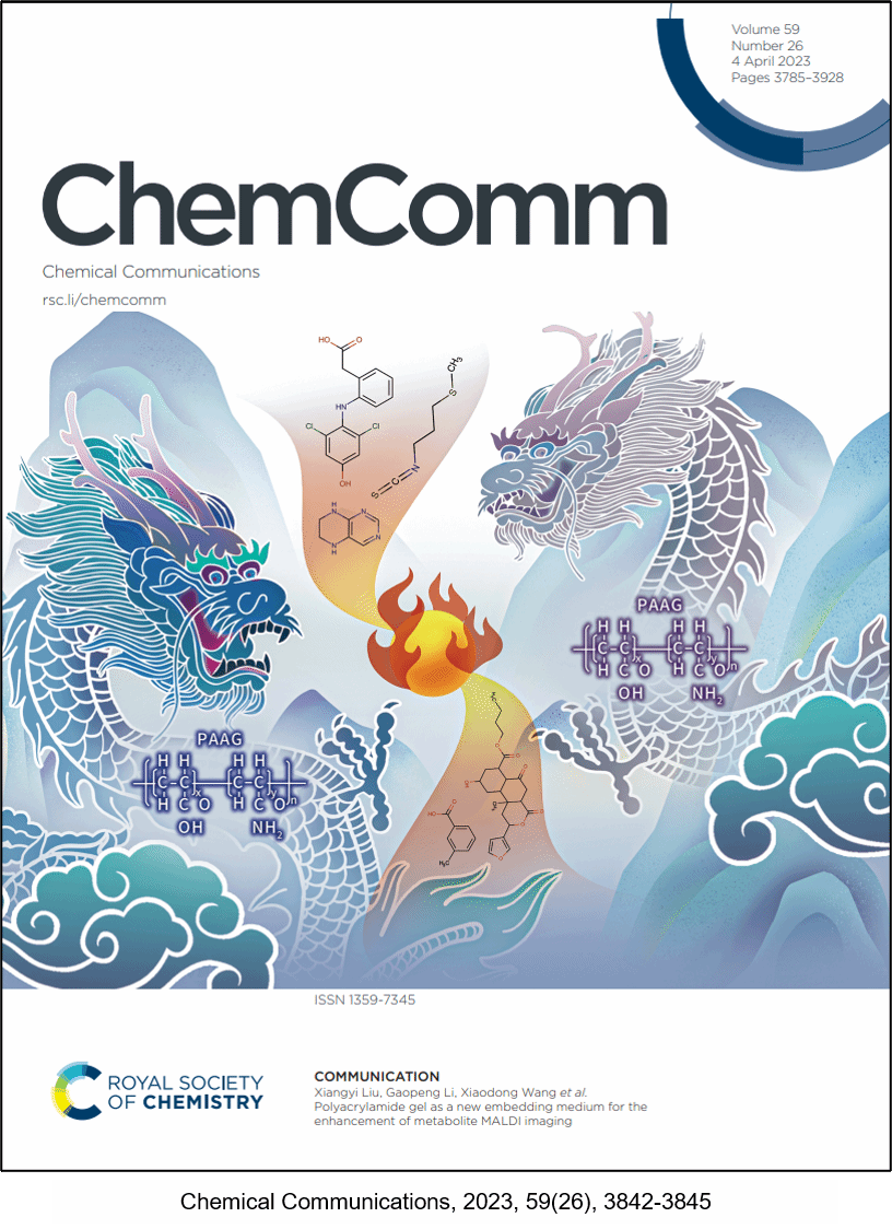 (质谱成像与代谢组学国家民委重点实验室)王晓东教授团队通过系统研究发现聚丙烯酰胺凝胶(Polyacrylamide gel,PAAG)作为一种新型包埋剂可显著提高MALDI-MSI前处理流程中生物组织样本中切片的质量,并增强小分子代谢物和脂质的原位检测及成像表征性能。这是在MALDI源质谱成像新方法开发领域取得的又一项重要进展,相关研究成果以“Polyacrylamide gel as a new embedding medium for the enhancement of metabolite MALDI imaging”为题,发表在分析化学综合权威期刊《Chemical Communications》(Nature Index收录)上,该研究论文同时被遴选为期刊封面文章(Front Cover)。这是王晓东教授团队继在分析化学顶级期刊《Analytical Chemistry》(2021, 93(35), 11920-11928, Front Cover)、《Chemical Communications》(2021, 57(82), 10707-10710, Back Cover)、《Chemical Communications》(2022, 58(5), 633-636, Front Cover)连续三次发表封面文章后,第四次入选期刊封面文章(Front Cover),蜜桃导航