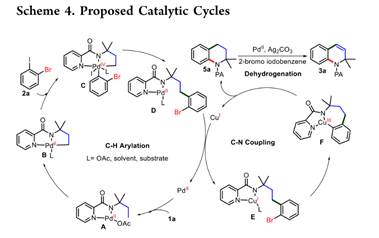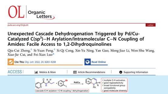 饱和烷烃脱氢制备高价值烯烃是工业生产和合成化学中重要的化学反应,但其苛刻反应条件仍待进一步改进。近年来,利用Pd催化碳氢键活化实现高选择性脱氢反应取得了重要进展,但其底物主要局限于含有酸性活泼氢的羰基类化合物。对于普遍存在的中性惰性碳氢键的烷烃脱氢反应鲜有文献报道。近日,蜜桃导航 罗斐贤研究组利用前期发展的碳氢键活化启动的串联反应策略(Org. Lett. 2019, 21, 1668.),探索Pd/Cu协同催化生物质醇小分子衍生制备的酰胺合成高价值四氢喹啉化合物,意外发现了串联中性碳氢键脱氢反应得到具有重要应用价值的1,2−二氢喹啉分子骨架。通过机理研究证实,该反应首先经历Pd催化分子间碳氢键芳基化反应,接下来Cu催化串联分子内碳氮键偶联和后续Pd催化四氢喹啉β,γ−脱氢反应得到1,2−二氢喹啉化合物,实现了三步反应一锅法高效有序转化。此外,脱氢反应步骤中Ag2CO和卤代烃都至关重要。该研究为烷烃脱氢制备高价值烯烃提供了一种全新策略,具有重要的理论价值和潜在应用价值。相关研究成果以Unexpected Cascade Dehydrogenation Triggered by Pd/Cu−Catalyzed C(sp3)−H Arylation/Intramolecular C−N Coupling of Amides: Facile Access to 1,2−Dihydroquinolines为题在《Organic Letters》(化学1区,有机化学TOP期刊,IF=6.072 (Nature Index收录),Org. Lett. 2022, 24, 8283.)上发表。//doi.org/10.1021/acs.orglett.2c03203