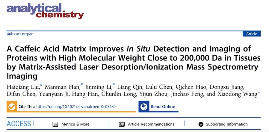 (质谱成像与代谢组学国家民委重点实验室)王晓东教授团队在MALDI-MSI蛋白质原位检测及成像表征新型基质研究领域取得了又一重要进展。相关研究成果以“A Caffeic Acid Matrix Improves In Situ Detection and Imaging of Proteins with High Molecular Weight Close to 200,000 Da in Tissues by Matrix-Assisted Laser Desorption/Ionization Mass Spectrometry Imaging”为题,发表在分析化学顶级期刊《Analytical Chemistry》(Nature Index收录)上,该研究论文同时被遴选为期刊封面文章。蜜桃导航